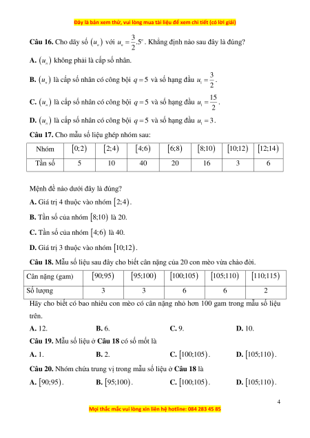 Câu 18. Mẫu số liệu sau đây cho biết cân nặng của 20 con mèo vừa chào đời. Cân nặng (gam) 90;95