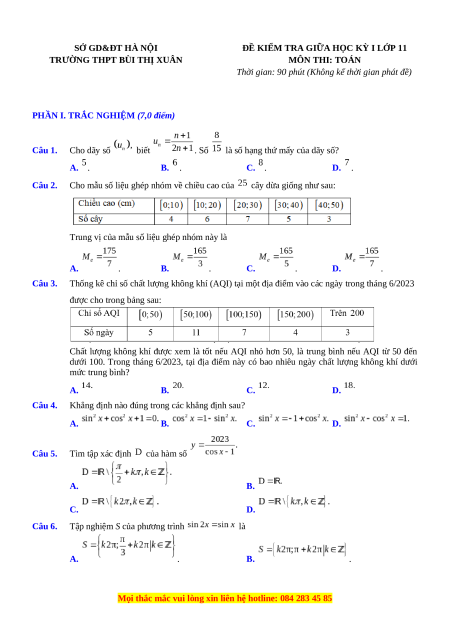 Đề thi giữa kì 1 Toán 11 trường THPT Bùi Thị Xuân - Hà Nội năm 2023-2024