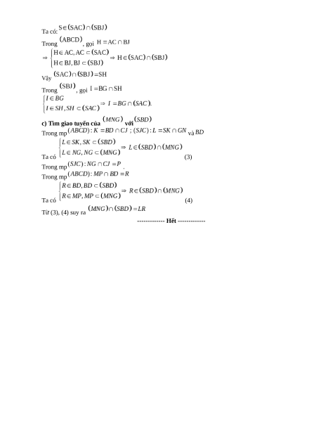 Gọi là trọng tâm tam giác , là trung điểm cạnh . Điểm trên cạnh sao cho . a) Tìm giao tuyến của và . b) Tìm giao điểm của với . c) Tìm giao tuyến của với . Lời giải a) Ta có Trong , gọi Từ suy ra .
