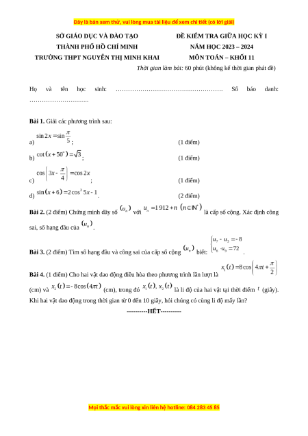 Đề thi giữa kì 1 Toán 11 trường THPT Nguyễn Thị Minh Khai - TP Hồ Chí Minh năm 2023-2024