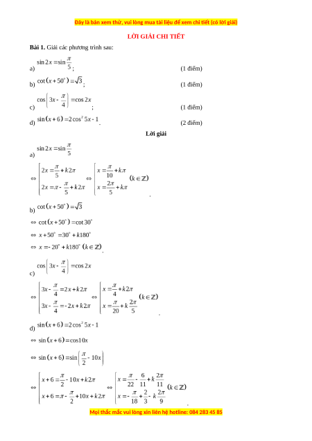 Bài 1. Giải các phương trình sau: a) ; (1 điểm) b) ; (1 điểm) c) ; (1 điểm) d) . (2 điểm) Lời giải a) . b) . c) . d) .