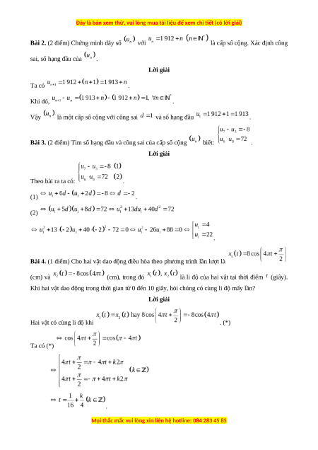 Bài 3. (2 điểm) Tìm số hạng đầu và công sai của cấp số cộng biết: . Lời giải Theo bài ra ta có: . (1) . (2) .