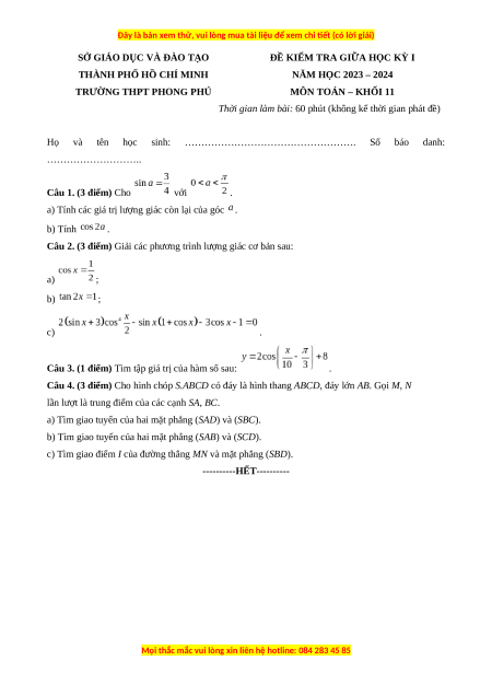 Đề thi giữa kì 1 Toán 11 trường THPT Phong Phú - TP Hồ Chí Minh năm 2023-2024