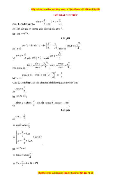 Câu 2. (3 điểm) Giải các phương trình lượng giác cơ bản sau: a) ; b) ; c) .