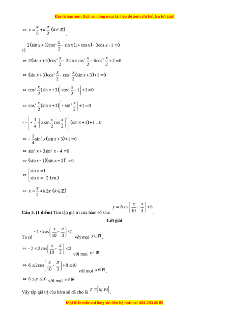 Câu 2. (3 điểm) Giải các phương trình lượng giác cơ bản sau: a) ; b) ; c) . Lời giải a) . b)