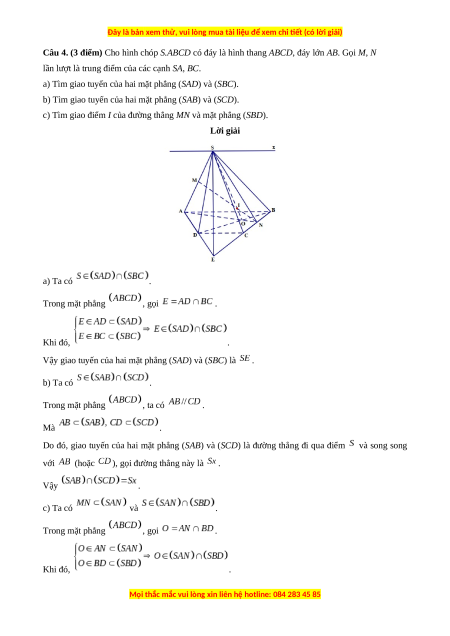 Vậy giao tuyến của hai mặt phẳng (SAD) và (SBC) là . b) Ta có . Trong mặt phẳng , ta có . Mà .