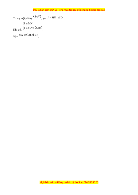 c) Tìm giao điểm I của đường thẳng MN và mặt phẳng (SBD). Lời giải a) Ta có . Trong mặt phẳng , gọi . Khi đó, .