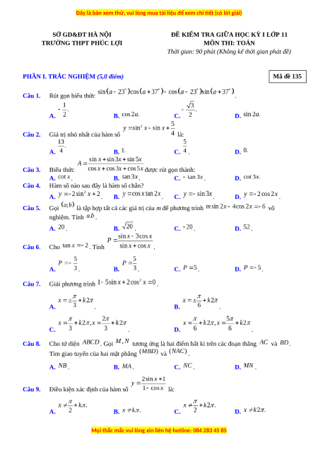 PHẦN I. TRẮC NGHIỆM (5,0 điểm) Mã đề 135 Câu 1. Rút gọn biểu thức . A. B. C. D. Câu 2.