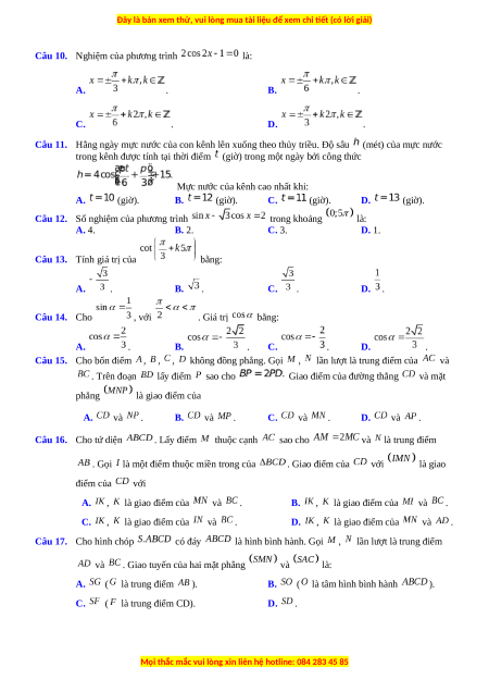 Câu 11. Hằng ngày mực nước của con kênh lên xuống theo thủy triều. Độ sâu (mét) của mực nước