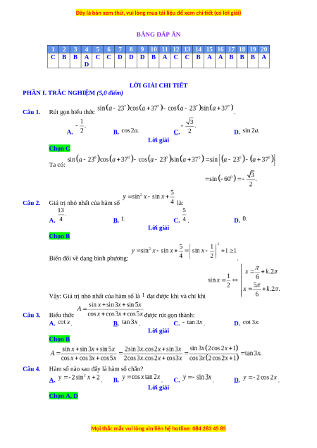 Giá trị nhỏ nhất của hàm số là: A. B. C. . D. Câu 3. Biểu thức được rút gọn thành: A. . B. . C. . D. Câu 4.