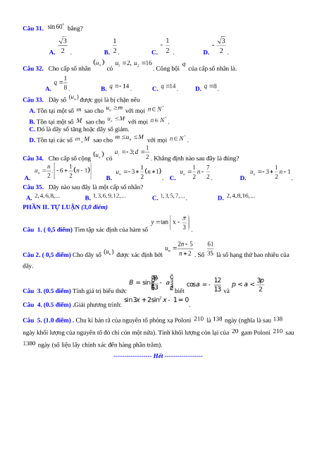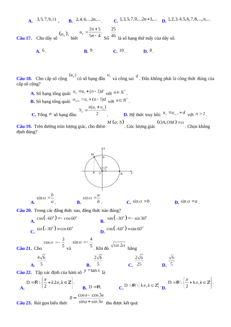 . Công sai của cấp số cộng là: A. B. C. D. . Câu 15. Hàm số xác định khi: A. . B. . C. . D. .