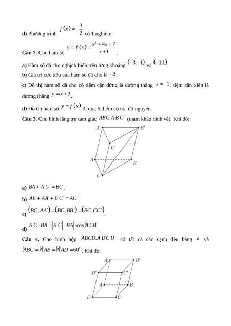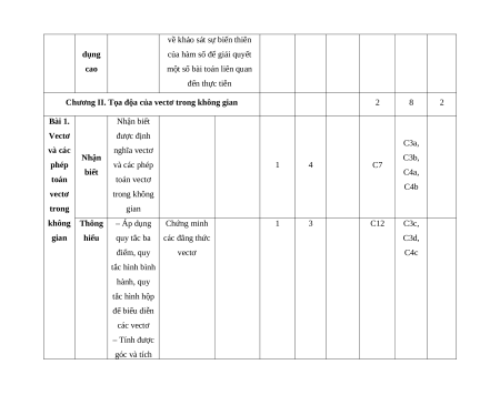 Chương II. Tọa độ của vectơ trong không gian (Bài 1) Số lệnh hỏi 5 4 2 1 12 Số điểm 1,25 1 0,75 0,5 3,5 7, 12, 4d, Câu số/Phần 3a, 3b, 4a, 4b 3c, 3d, 4c 3 6 (I, II, III) I, II I, II II, III III Thành tố NL TD QGVĐ GQVĐ MHH Tổng điểm 3,5 2,75 2,25 1,5 10 Lưu ý:
