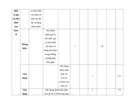 khoảng dựa số trong bảng vào dấu của biến thiên đạo hàm cấp một của nó Vận dụng đạo hàm và tính đơn điệu của Vận hàm số để 1 C1 dụng giải quyết một số bài toán thực tiễn Bài 2. Nhận Nhận biết 1 1 C3 C1c Giá trị biết được giá trị lớn lớn nhất, giá