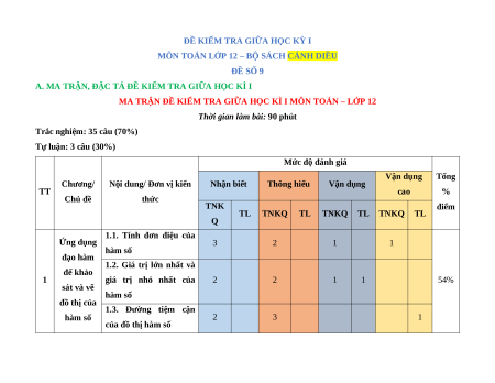 - Tailieugiaovien.com.vn giới thiệu bộ đề giữa kì 1 gồm đầy đủ ma trận và lời giải chi tiết môn Toán 12 Cánh diều mới nhất năm 2024 nhằm giúp Giáo viên có thêm tài liệu tham khảo ra đề thi Toán 12.