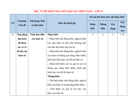 ĐẶC TẢ ĐỀ KIỂM TRA GIỮA HỌC KÌ I MÔN TOÁN – LỚP 12