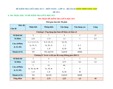 Chương II. Vectơ và hệ tọa độ trong không gian (Bài 1) Số lệnh hỏi 5 4 2 1 12 Số điểm 1,25 1 0,75 0,5 3,5 7, 12, 4d, Câu số/Phần 3a, 3b, 4a, 4b 3c, 3d, 4c 3 6 (I, II, III) I, II I, II II, III III Thành tố NL TD QGVĐ GQVĐ MHH Tổng điểm 3,5 2,75 2,25 1,5 10 Lưu ý:
