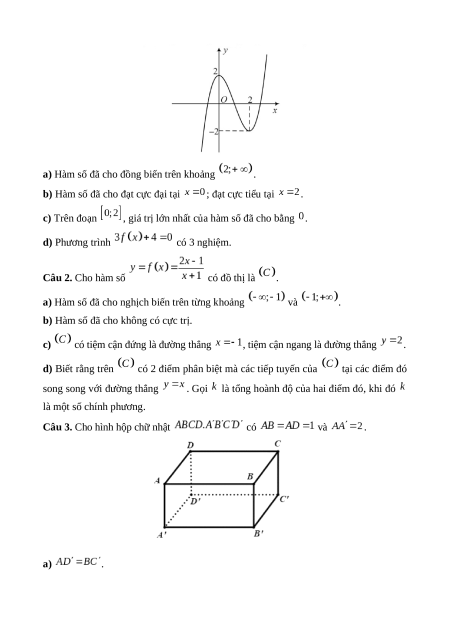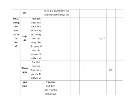 Chương I. Ứng dụng đạo hàm để khảo sát 10 8 4 hàm số Bài 1. Nhận Nhận biết 2 2 C1, C2 C1a, Tính biết được tính C1b đơn đơn điệu, điệu điểm cực trị, và cực giá trị cực trị trị của của hàm số hàm thông qua số bảng biến thiên hoặc thông qua hình ảnh của đồ thị Xét tính