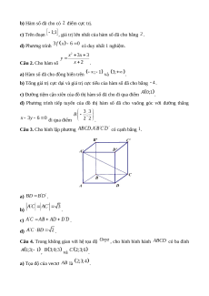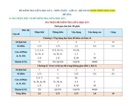 Chương II. Vectơ và hệ tọa độ trong không gian (Bài 1, Bài 2) Số lệnh hỏi 7 4 3 1 15 Số điểm 1,75 1 1,25 0,5 4,5 5, 6, 7, 12, 4d, Câu số/Phần 3a, 3b, 4a, 4b 3c, 3d, 4c 3, 4 6 (I, II, III) I, II I, II II, III III Thành tố NL TD QGVĐ GQVĐ MHH Tổng điểm 3,5 2,75 2,75 1,0 10 Lưu ý: