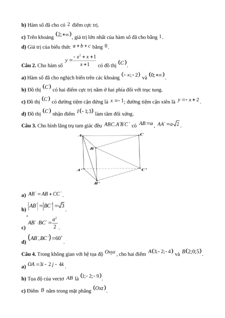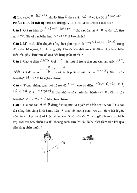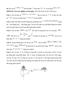 Chương II. Vectơ và hệ tọa độ trong không gian (Bài 1, Bài 2) Số lệnh hỏi 7 4 3 1 15 Số điểm 1,75 1 1,25 0,5 4,5 5, 6, 7, 12, 4d, Câu số/Phần 3a, 3b, 4a, 4b 3c, 3d, 4c 3, 4 6 (I, II, III) I, II I, II II, III III Thành tố NL TD QGVĐ GQVĐ MHH Tổng điểm 3,5 2,75 2,75 1,0 10 Lưu ý:
