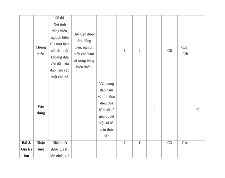 khoảng dựa số trong bảng vào dấu của biến thiên đạo hàm cấp một của nó Vận dụng đạo hàm và tính đơn điệu của Vận hàm số để 1 C1 dụng giải quyết một số bài toán thực tiễn Bài 2. Nhận Nhận biết 1 1 C3 C1c Giá trị biết được giá trị lớn lớn nhất, giá