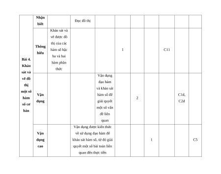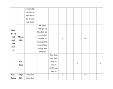 Chương I. Ứng dụng đạo hàm để khảo sát 8 8 3 hàm số Bài 1. Nhận Nhận biết 2 2 C1, C2 C1a, Tính biết được tính C1b đơn đơn điệu, điệu điểm cực trị, và cực giá trị cực trị trị của của hàm số hàm thông qua số bảng biến thiên hoặc thông qua hình ảnh của đồ thị Xét tính
