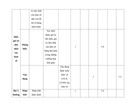 khoảng dựa số trong bảng vào dấu của biến thiên đạo hàm cấp một của nó Vận dụng đạo hàm và tính đơn điệu của Vận hàm số để 1 C1 dụng giải quyết một số bài toán thực tiễn Bài 2. Nhận Nhận biết 1 1 C3 C1c Giá trị biết được giá trị lớn lớn nhất, giá