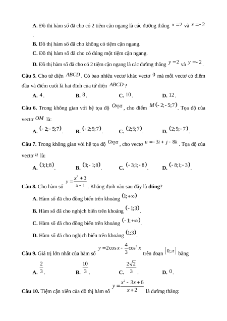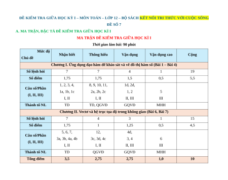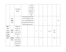 Chương II. Vectơ và hệ trục tọa độ trong không gian (Bài 6, Bài 7) Số lệnh hỏi 7 4 3 1 15 Số điểm 1,75 1 1,25 0,5 4,5 5, 6, 7, 12, 4d, Câu số/Phần 3a, 3b, 4a, 4b 3c, 3d, 4c 3, 4 6 (I, II, III) I, II I, II II, III III Thành tố NL TD QGVĐ GQVĐ MHH Tổng điểm 3,5 2,75 2,75 1,0 10 Lưu ý: