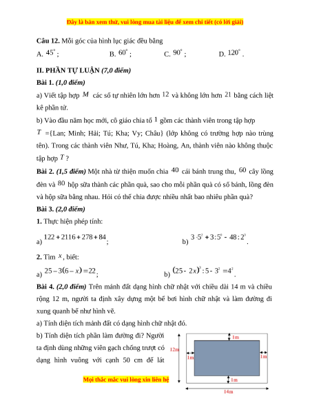 Câu 12. Mỗi góc của hình lục giác đều bằng A. ; B. ; C. ; D. .