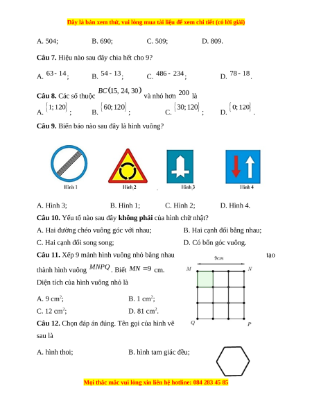 Câu 7. Hiệu nào sau đây chia hết cho 9? A. ; B. ; C. ; D. .