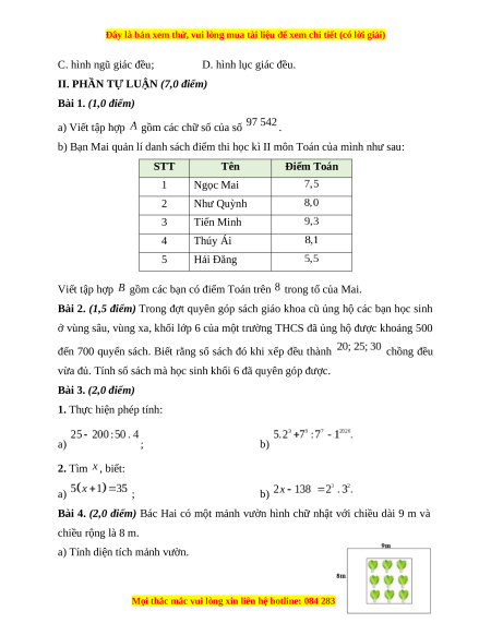 Bài 4. (2,0 điểm) Bác Hai có một mảnh vườn hình chữ nhật với chiều dài 9 m và chiều rộng là 8 m.