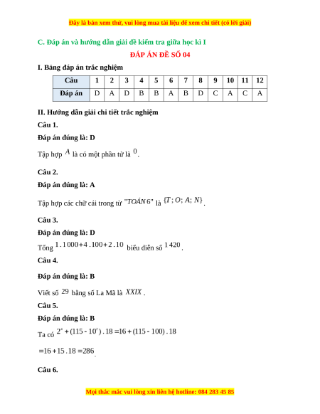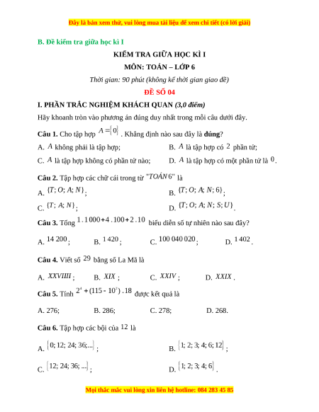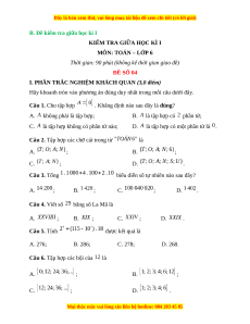 biểu diễn số tự nhiên nào sau đây? A. ; B. ; C. ; D. . Câu 4. Viết số bằng số La Mã là A. ; B. ; C. ; D. . Câu 5. Tính được kết quả là A. 276; B. 286; C. 278; D. 268.