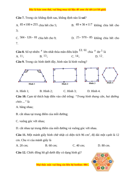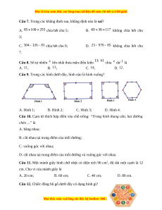Câu 7. Trong các khẳng định sau, khẳng định nào là sai? A. chia hết cho 5; B. không chia hết cho 3; C. chia hết cho 9; D. không chia hết cho 7.