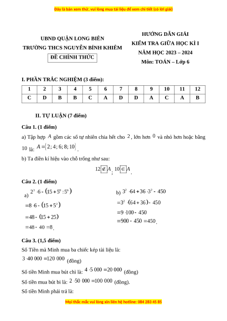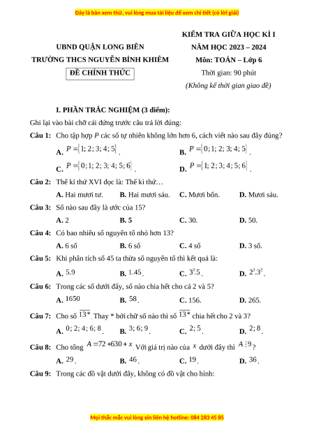 Đề thi giữa kì 1 Toán 6 Cánh diều trường THCS Nguyễn Bỉnh Khiêm - Hà Nội