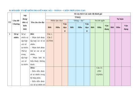 B. BẢN ĐẶC TẢ ĐỀ KIỂM TRA GIỮA HỌC KÌ 1 – TOÁN 6 – CHÂN TRỜI SÁNG TẠO