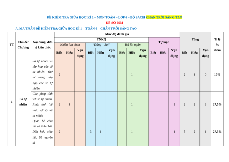 A. MA TRẬN ĐỀ KIỂM TRA GIỮA HỌC KÌ 1 – TOÁN 6 – CHÂN TRỜI SÁNG TẠO Mức độ đánh giá TNKQ Tổng Tỉ lệ