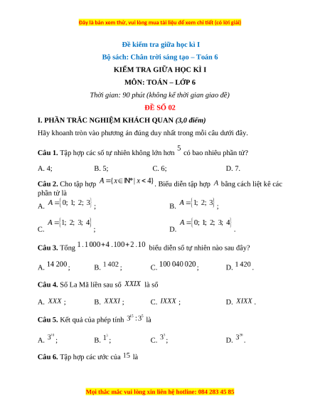 Câu 1. Tập hợp các số tự nhiên không lớn hơn có bao nhiêu phần tử? A. 4; B. 5; C. 6; D. 7.