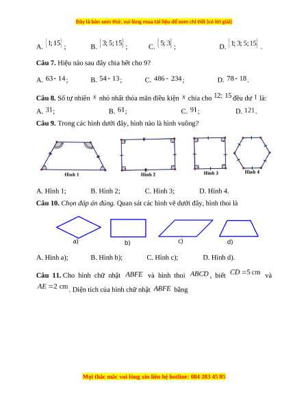 Câu 8. Số tự nhiên nhỏ nhất thỏa mãn điều kiện chia cho đều dư là: A. ; B. ; C. ; D. .