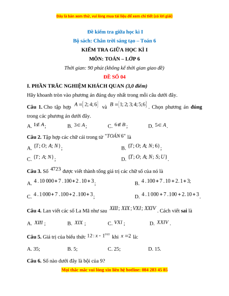 Đề thi giữa kì 1 Toán 6 Chân trời sáng tạo (Đề 4)
