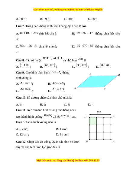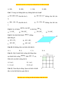 Câu 7. Trong các khẳng định sau, khẳng định nào là sai? A. chia hết cho 5; B. không chia hết cho 3; C. chia hết cho 9; D. không chia hết cho 7.