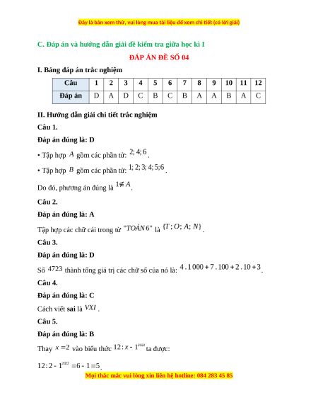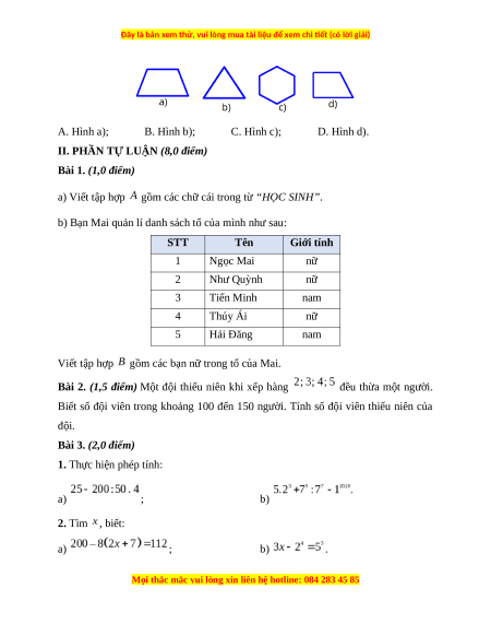 Câu 2. Tập hợp các chữ cái trong từ là A. ; B. ; C. ; D. . Câu 3. Số