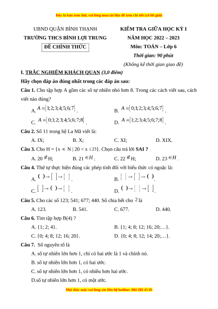 Đề thi giữa kì 1 Toán 6 Chân trời sáng tạo Trường THCS Bình Lợi Trung - Quận Bình Thạnh - TPHCM