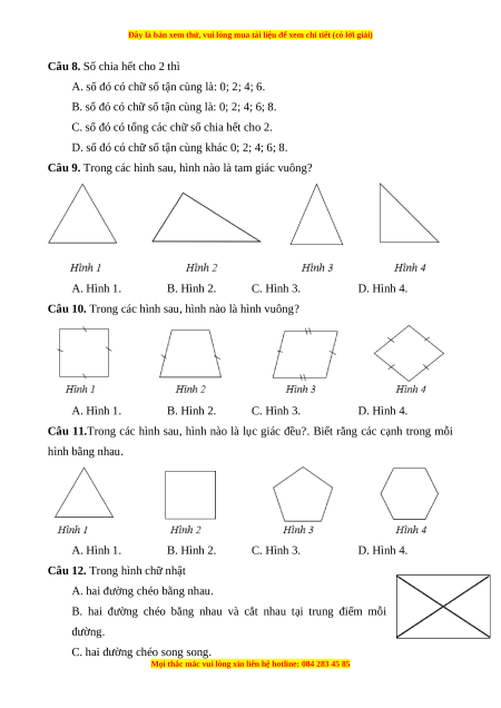 Câu 9. Trong các hình sau, hình nào là tam giác vuông? A. Hình 1. B. Hình 2. C. Hình 3. D. Hình 4.