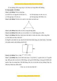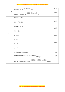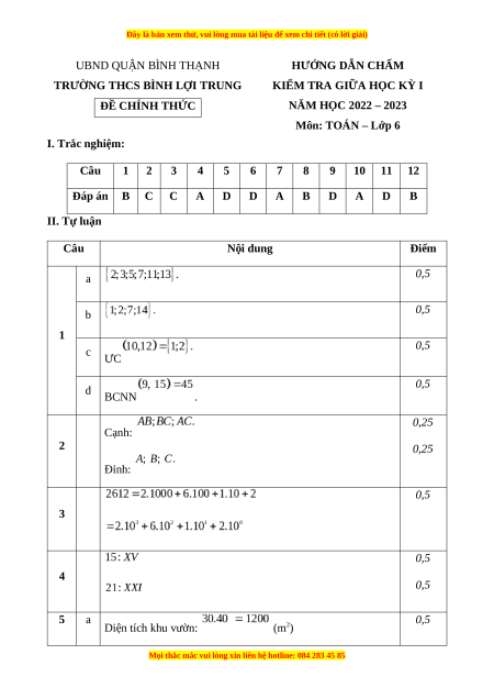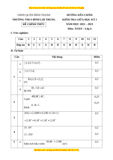 NĂM HỌC 2022 – 2023 Môn: TOÁN – Lớp 6 I. Trắc nghiệm: Câu 1 2 3 4 5 6 7 8 9 10 11 12 Đáp án B C C A D D A B D A D B II. Tự luận Câu Nội dung Điểm a 0,5 b 0,5 1 0,5 c ƯC 0,5 d BCNN . 0,25 Cạnh: 2 0,25 Đỉnh: 0,5 3 0,5 4 0,5 5 a 0,5 Diện tích khu vườn: (m2)