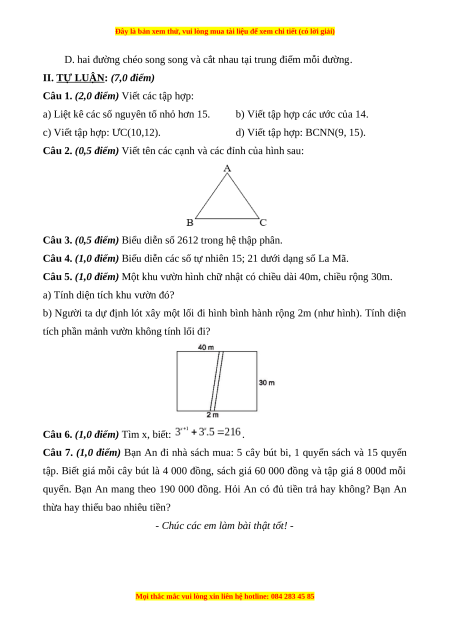 Câu 7. (1,0 điểm) Bạn An đi nhà sách mua: 5 cây bút bi, 1 quyển sách và 15 quyển