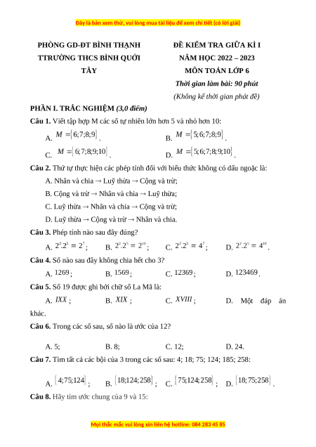 NĂM HỌC 2022 – 2023 TÂY MÔN TOÁN LỚP 6