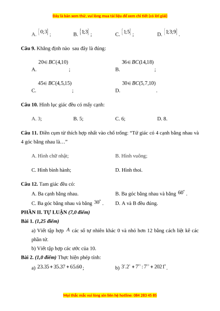 Câu 6. Trong các số sau, số nào là ước của 12? A. 5; B. 8; C. 12; D. 24.