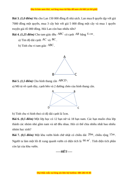 Bài 3. (1,0 điểm) Số tiền Lan còn là: (đồng) 1,0đ