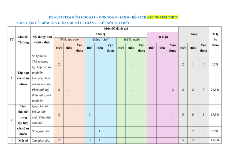 A. MA TRẬN ĐỀ KIỂM TRA GIỮA HỌC KÌ 1 – TOÁN 6 – KẾT NỐI TRI THỨC Mức độ đánh giá TNKQ Tổng Tỉ lệ
