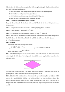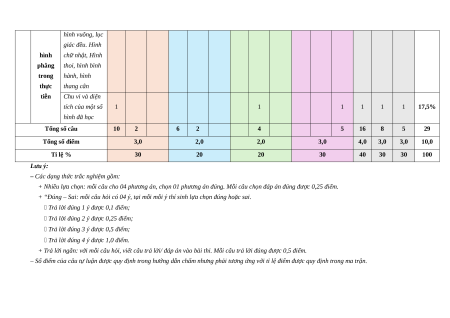 Một số Tam giác đều, 2 1 3 1 5 2 0 17,5% hình vuông, lục giác đều. Hình hình chữ nhật, Hình phẳng thoi, hình bình trong hành, hình thực thang cân tiễn Chu vi và diện tích của một số 1 1 1 1 1 1 17,5% hình đã học Tổng số câu 10 2 6 2 4 5 16 8 5 29 Tổng số điểm 3,0 2,0 2,0 3,0 4,0 3,0 3,0 10,0 Tỉ lệ % 30 20 20 30 40 30 30 100 Lưu ý: