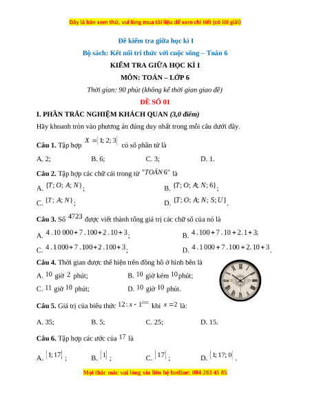 Đề thi giữa kì 1 Toán 6 Kết nối tri thức (Đề 1)